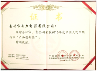 嘉興市奇力電器有限公司做為吊頂行業公認的“十大品牌”和中國建筑裝飾裝修材料協會天花吊頂材料分會常務副會長單位,應邀參加了這次盛會。公司憑借優異的研發團隊和在吊頂產品創新中取得的不俗成績,榮獲2016年度中國天花吊頂行業“產品創新獎”。